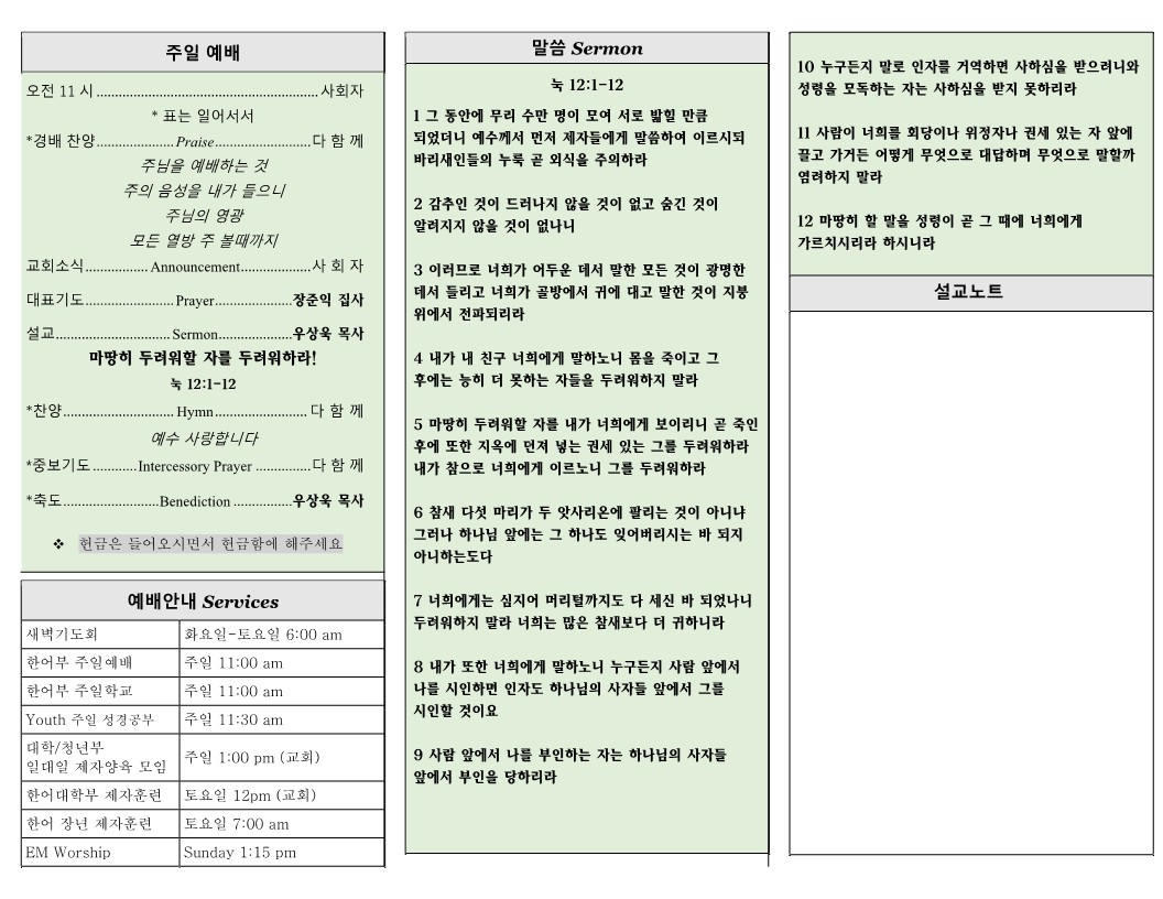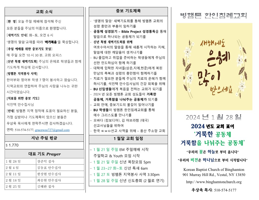 1월 28일 (주일) 교회 주보 날짜 : 2024.01.27 조회수 : 2092 목록 본문 1월 28일 (주일) 교회 주보 이전글2월 4일 (주일) 교회 주보 24.02.03 다음글1월 21일 (주일) 교회 주보 24.01.21 댓글 0 댓글목록 등록된 댓글이 없습니다. 목록