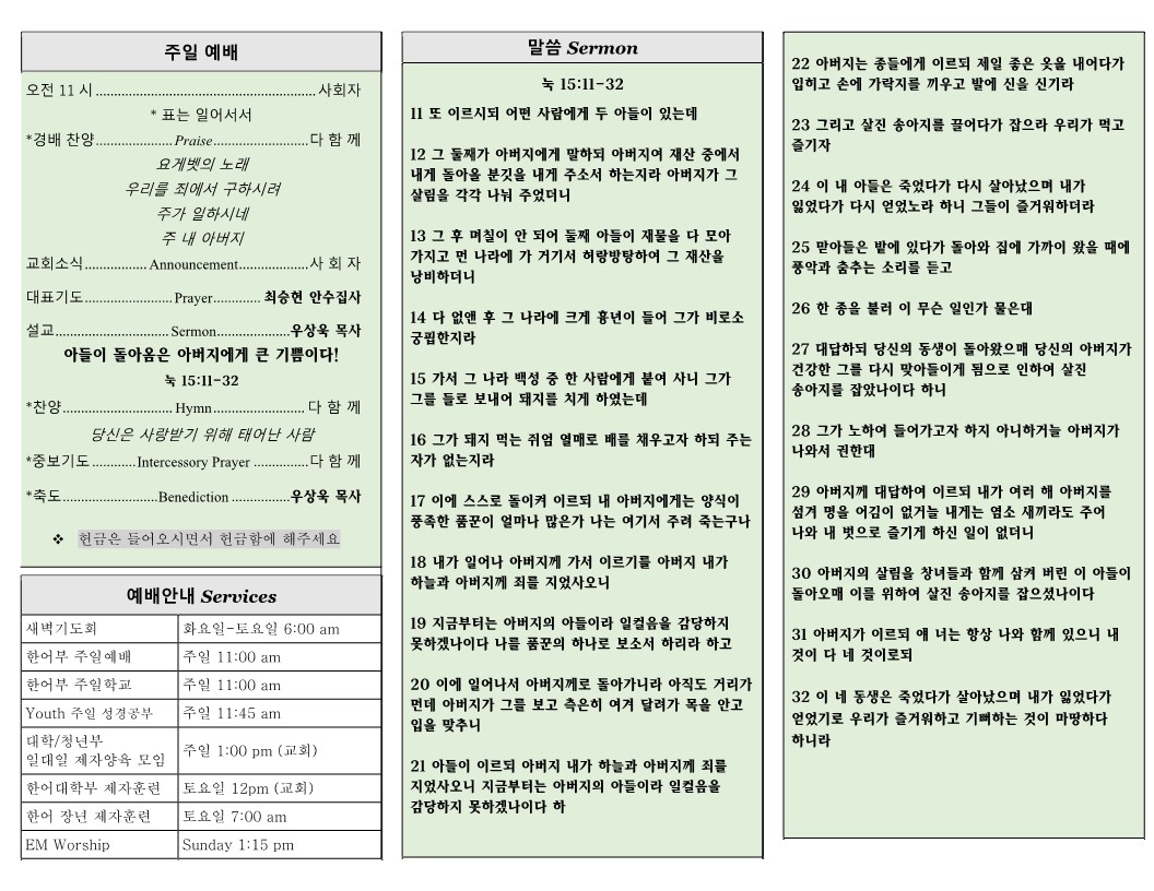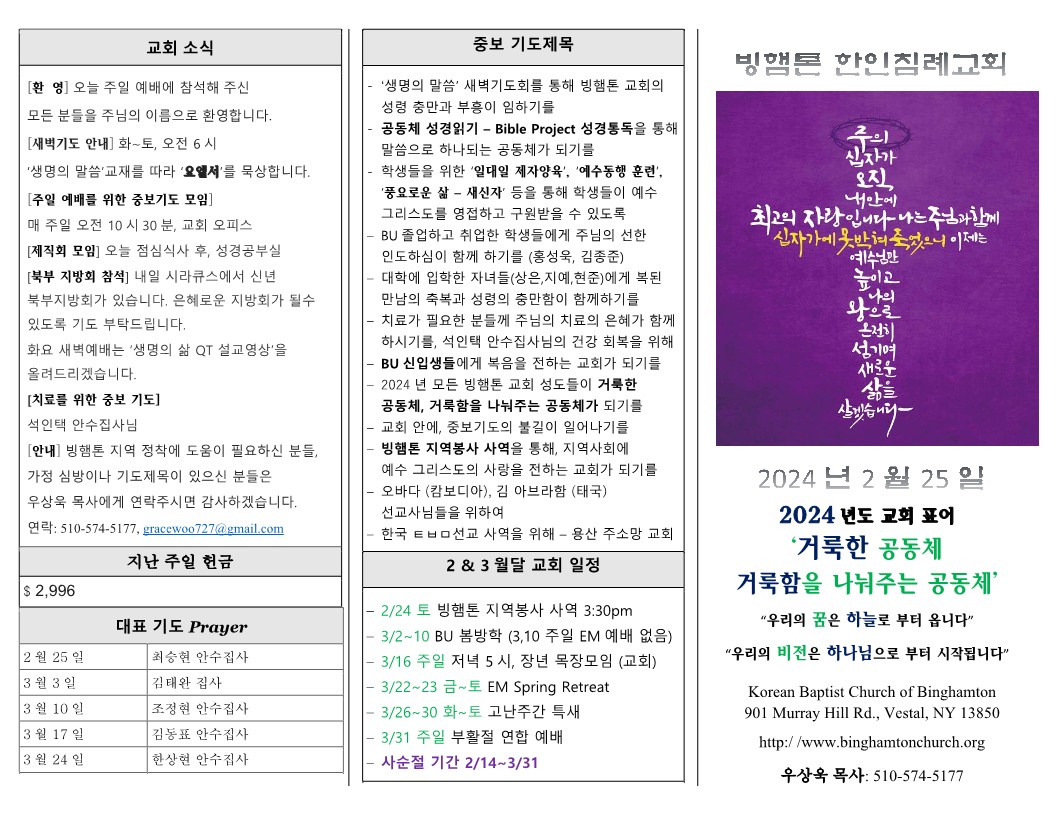2월 25일 (주일) 교회 주보 날짜 : 2024.02.24 조회수 : 1462 목록 본문 2월 25일 (주일) 교회 주보 이전글3월 3일 (주일) 교회 주보 24.03.02 다음글2월 18일 (주일) 교회 주보 24.02.17 댓글 0 댓글목록 등록된 댓글이 없습니다. 목록