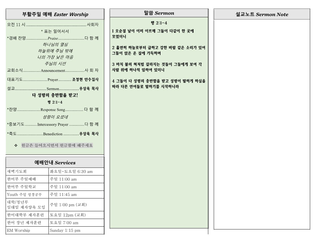 4월 28일 (주일) 교회 주보 날짜 : 2024.04.26 조회수 : 1537 목록 본문 4월 28일 (주일) 교회 주보 이전글5월 5일 (주일) 교회 주보 24.05.05 다음글4월 21일 (주일) 교회 주보 24.04.21 댓글 0 댓글목록 등록된 댓글이 없습니다. 목록