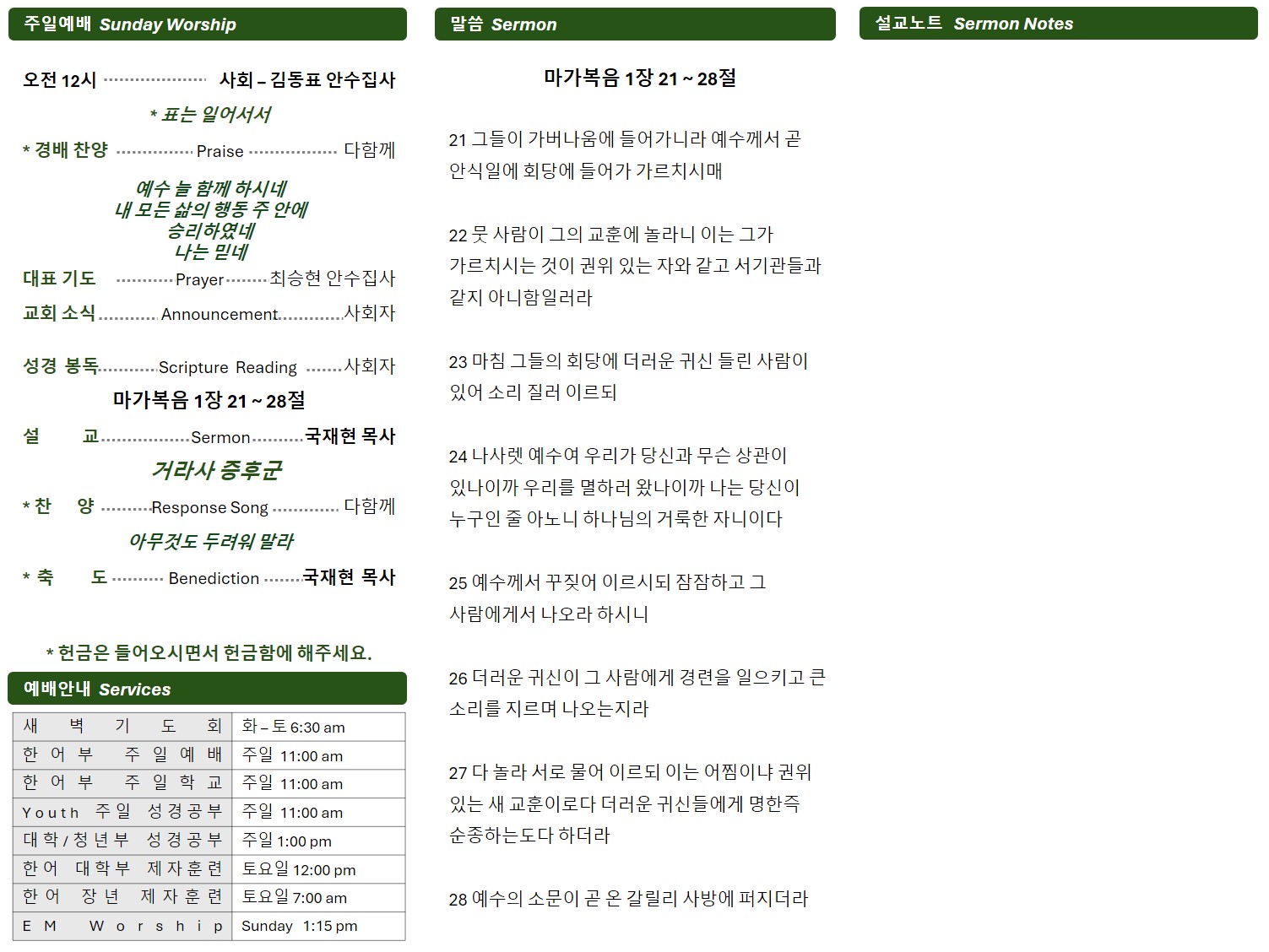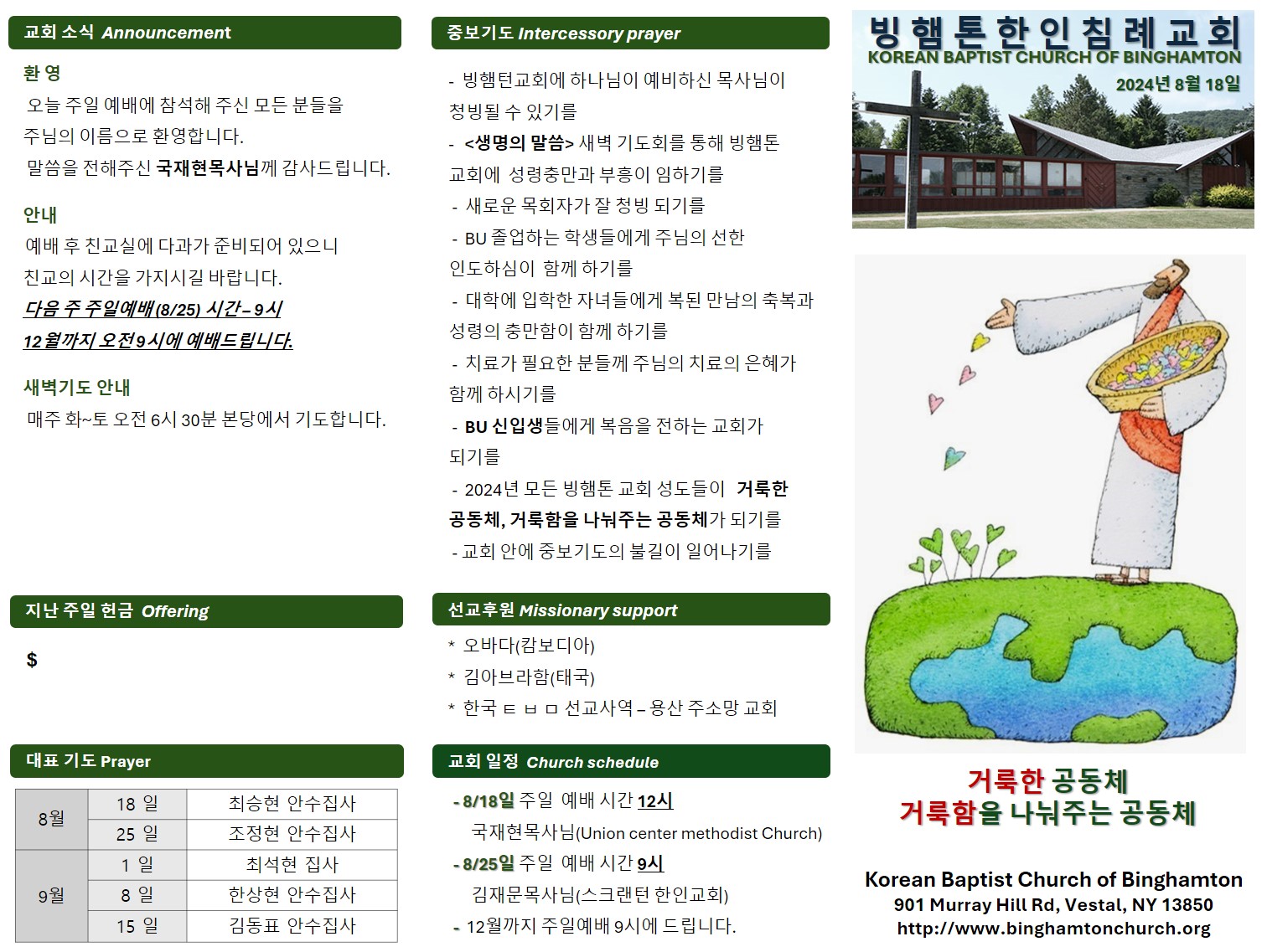 8월 18일 (주일) 교회 주보 날짜 : 2024.08.16 조회수 : 143 목록 본문 8월 18일 (주일) 교회 주보 다음글8월 11일 (주일) 교회 주보 24.08.08 댓글 0 댓글목록 등록된 댓글이 없습니다. 목록