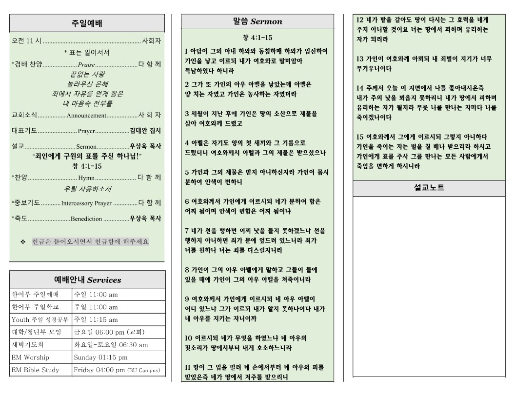 9월 25일 (주일) 교회 주보 날짜 : 2022.09.25 조회수 : 4179 목록 본문 9월 18일 (주일) 교회 주보 이전글10월 2일 (주일) 교회 주보 22.10.02 다음글9월 18일 (주일) 교회 주보 22.09.18 댓글 0 댓글목록 등록된 댓글이 없습니다. 목록