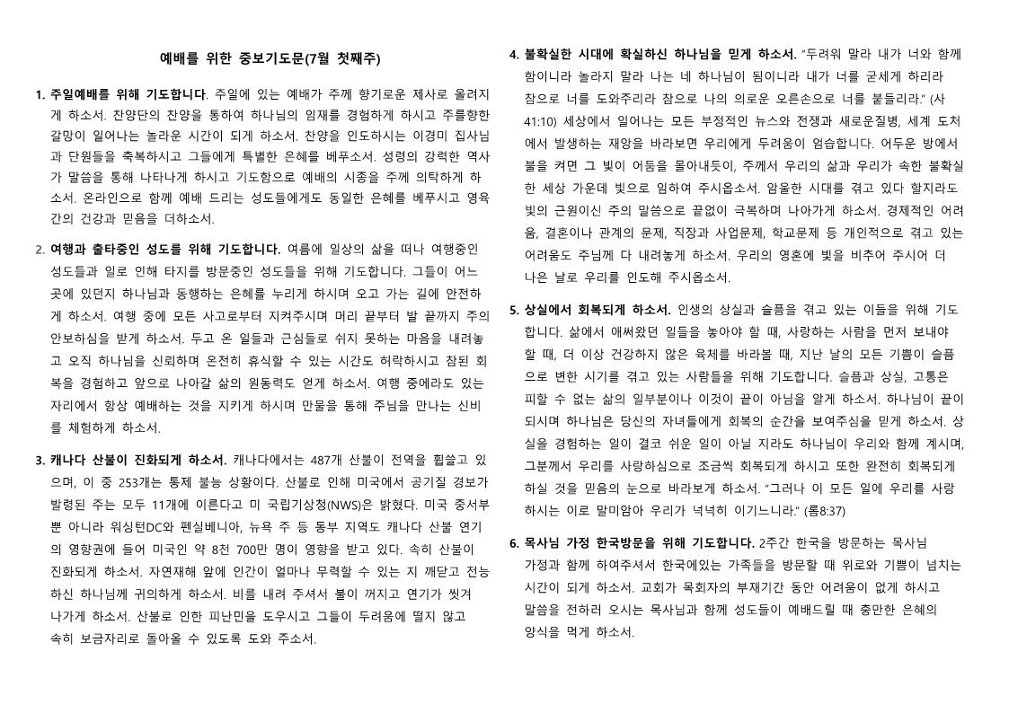 예배를 위한 중보기도문 (7월 첫째주) 날짜 : 2023.07.02 조회수 : 1205 목록 본문 예배를 위한 중보기도문 (7월 첫째주) 이전글예배를 위한 중보기도문 (8월 첫째주) 23.07.30 다음글예배를 위한 중보기도문 (6월 마지막주) 23.06.25 댓글 0 댓글목록 등록된 댓글이 없습니다. 목록
